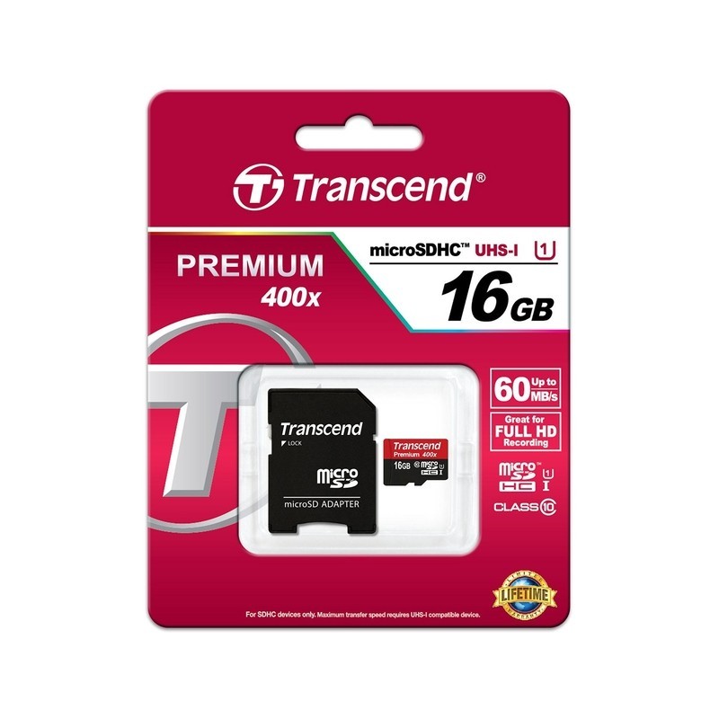 The 16GB Premium 400x microSDHC Class 10 UHS-I Memory Card with SD Adapter from Transcend features maximum read and write speeds of 60 MB/s and 20 MB/s, respectively. Its Ultra High Speed Class 1 (UHS-I) bus interface enables it to achieve these speeds, which are far greater than the 10MB/s minimum speeds guaranteed by the Class 10 rating. An SD adapter is supplied, allowing you to use the card in a full-size SDHC/SDXC slot. The card features built-in Error Correction Code (ECC) to automatically detect and fix transfer errors. It is backed by a limited lifetime warranty.